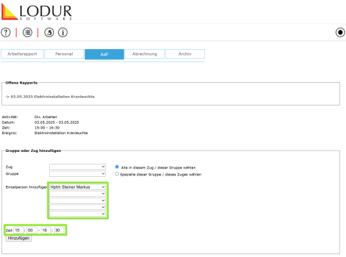 Person auswählen, welche die Arbeit Ausgeführt hat. Vorgang für jede weitere Person durchführen (ggf. Zeitfenster für einzelne Personen anpassen).